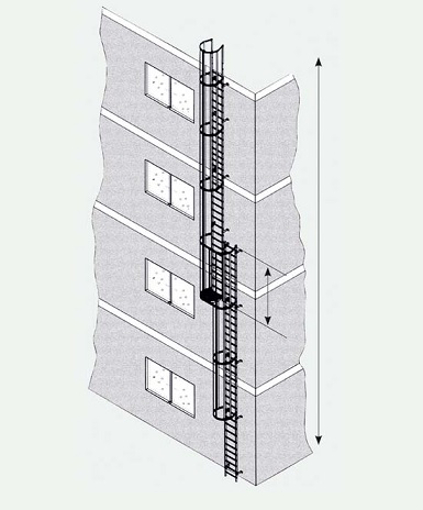 Ab einer bestimmten Gebäudehöhe (bei Maschinenaufstiegen und Notleitern gelten teilweise abweichende Bestimmungen) sind Steigleitern mit Rückenschutz auszuführen. Ein Leiterzug darf nicht mehr als 10 m Steighöhe haben (bei Maschienenaufstiegen und Notleitern gelten abweichende Bestimmungen), d.h. ab einer Gebäudehöhe von 10 m sind Steigleitern in versetzter Ausführung anzubringen (DIN 18799-1). Ist dies nicht möglich, muss in dem Leiterzug mind. alle 10 m ein klappbares Podest vorgesehen sein. Außerdem Bedarf es dann unbedingt einer Genehmigung der örtlichen Behörden. Grundsätzlich entscheiden die zuständigen Behörden (Brandschutzbehörde etc.) vor Ort über die Art der Ausführung und Genehmigung. Normen und Vorschriften können sich ändern. Haftungsausschluss: Alle Angaben ohne Gewähr. Hinweise für die Auslegung und Befestigung: