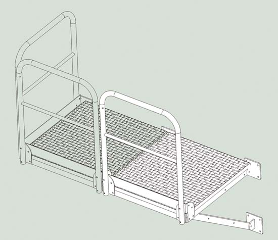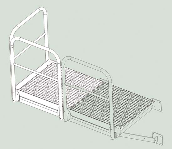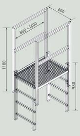 1 Gitterrostbelag und 1 Anbaukonsole.Geländer an einer Längsseite mit Geländerverbinder. Erweiterungspodeste beliebig aneinander schraubbar.